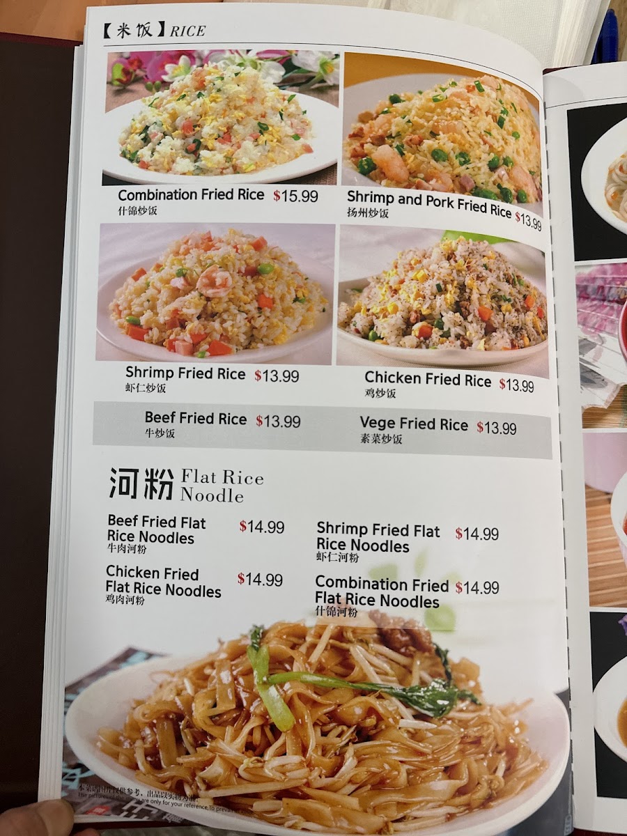 Flat Rice Noodles: Several varieties of fried flat rice noodles are offered, including chicken, beef, shrimp, and combination options, each priced uniformly.
