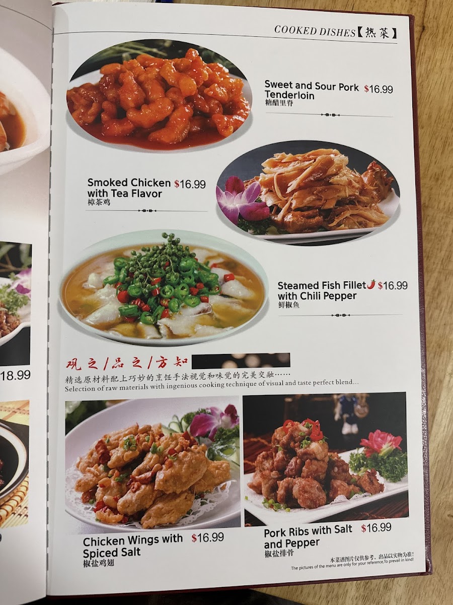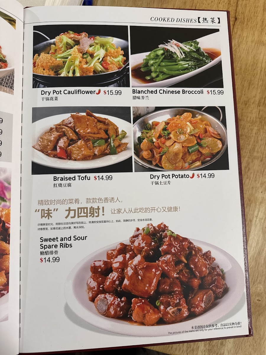 Beverages: The drink menu includes traditional choices such as ice tea lemonade, Chinese orange soda, plum juice, as well as common soft drinks like Coke, Diet Coke, and Sprite. Additionally, the menu features regional specialty drinks such as Wahaha calcium milk.