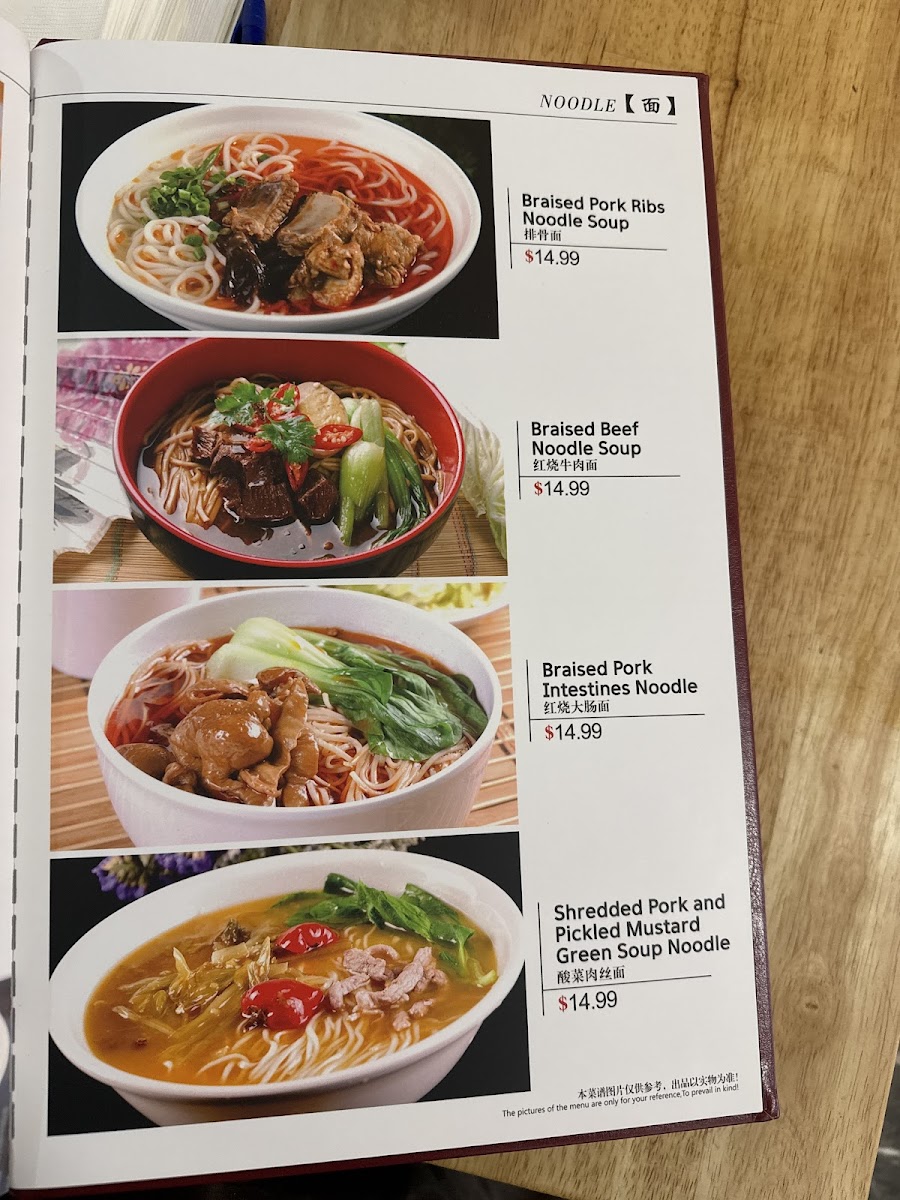 Noodles: A selection of noodle dishes is available, including spicy handmade noodles, dry-fried string beans, braised beef noodle soup, and Wuhan hot dry noodles. These options vary from soup-based to stir-fried preparations, featuring diverse proteins and flavors.